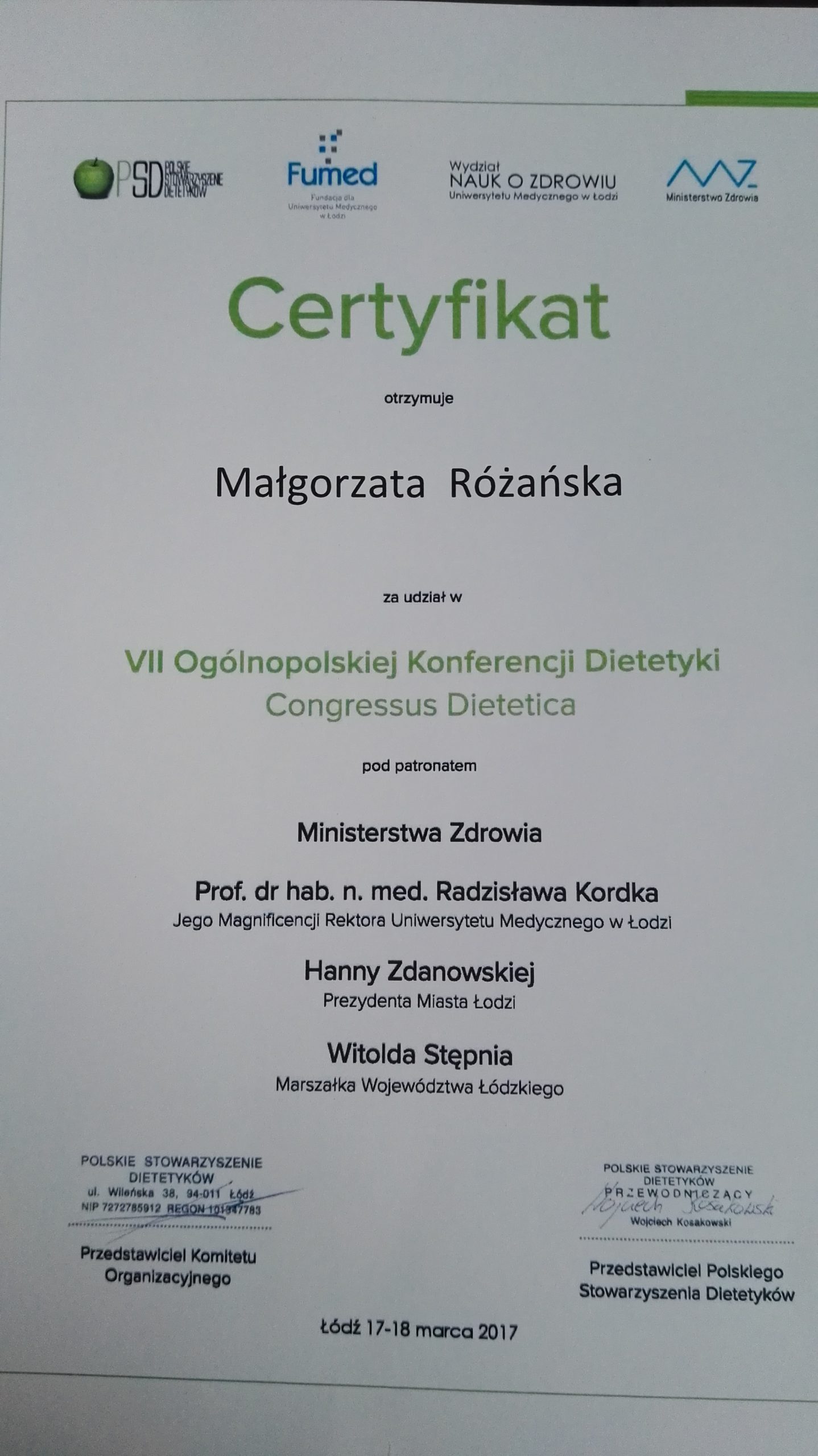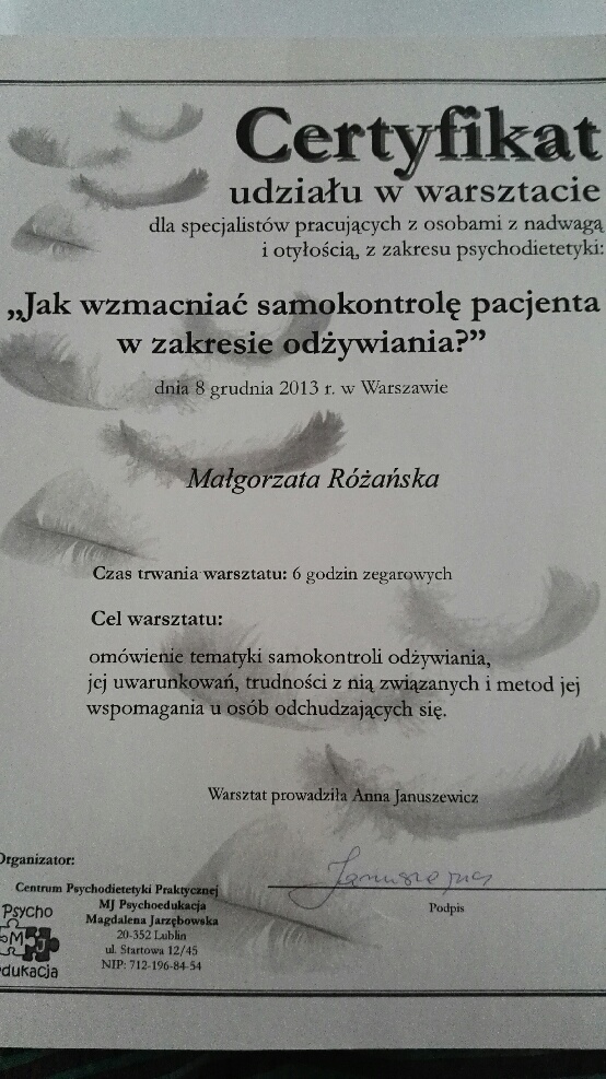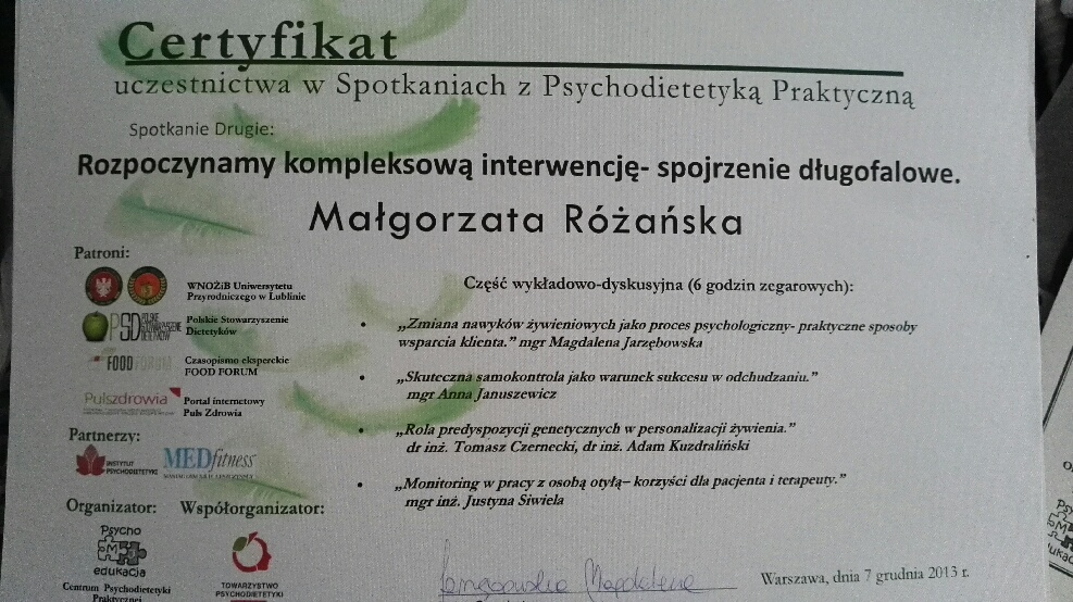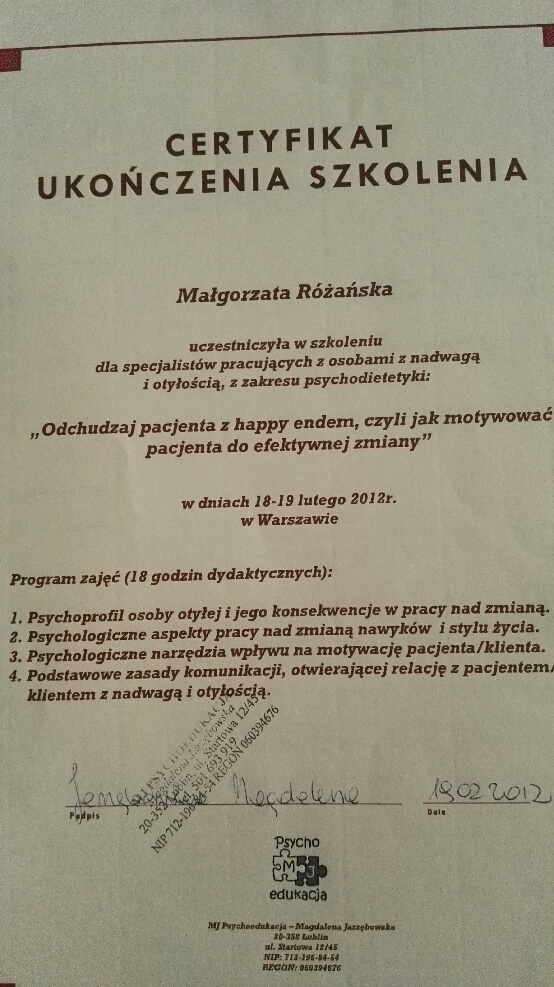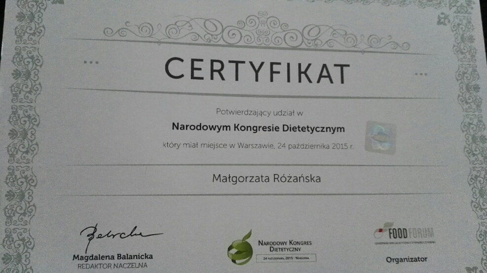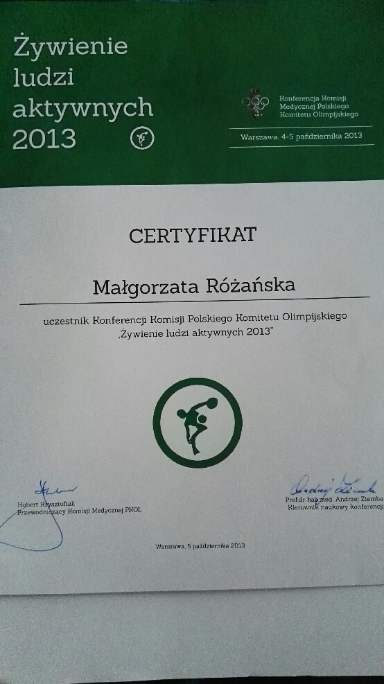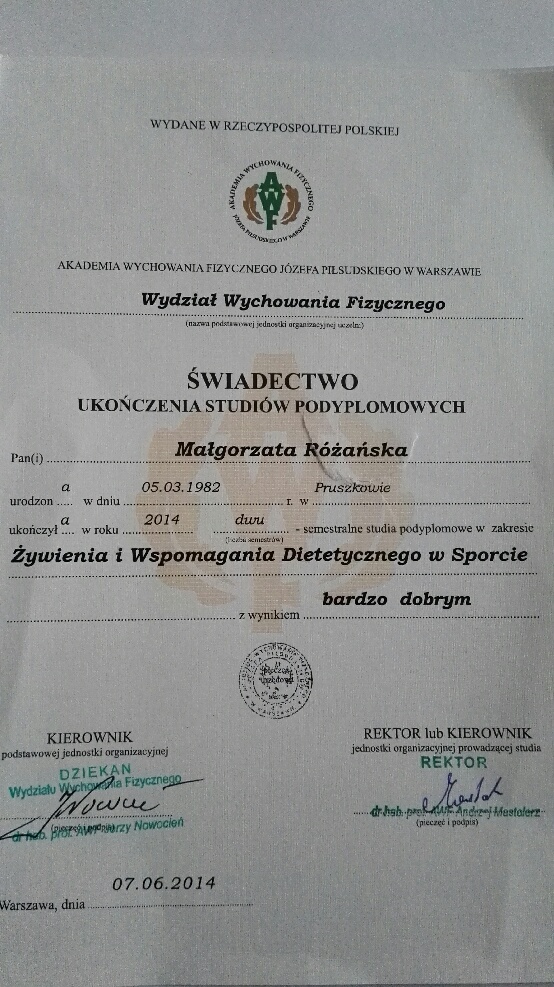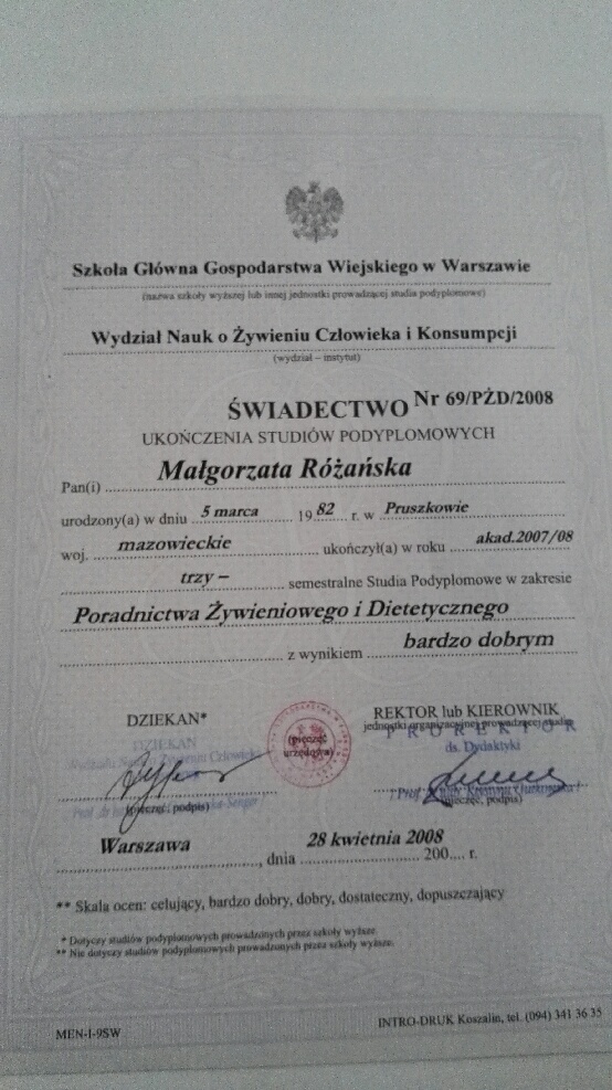 Ukończyłam magisterskie studia na Wydziale Nauk o Żywieniu Człowieka i Konsumpcji (kierunek żywienie człowieka i dietetyka) oraz Podyplomowe Studia „Poradnictwo Dietetyczne i Żywieniowe” w Szkole Głównej Gospodarstwa Wiejskiego w Warszawie i „Żywienie i wspomaganie dietetyczne w sporcie” na warszawskiej Akademii Wychowania Fizycznego.